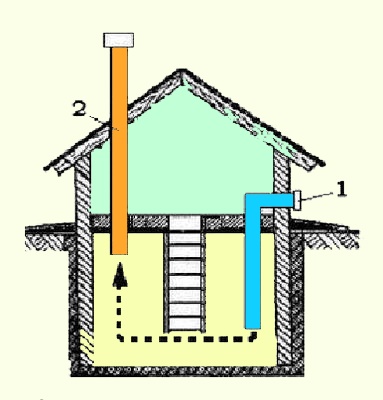 Суть естественной вентиляции состоит в наличии двух труб: вытяжной и приточной. Край первой устанавливается под потолком, и через нее выходит наружу легкий теплый воздух, а вторая должна заканчиваться внизу, недалеко от пола, и при помощи данного канала осуществляется приток.